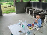 しかし、やはり台風と梅雨前線での天候悪化が気になるので、本意ではないが炊事棟にテーブルを広げる。