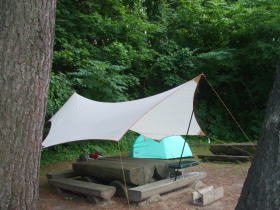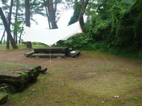 場所の広さに制限もあるので、タープをその上に掛けてしまった・・・晴れてはいるが、天気予報は雨予報なのだ。