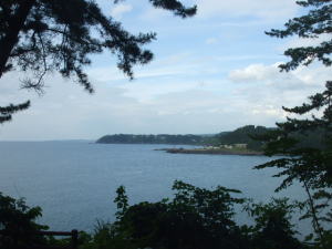 木の幹の間から穏やかな湾風景が望める。