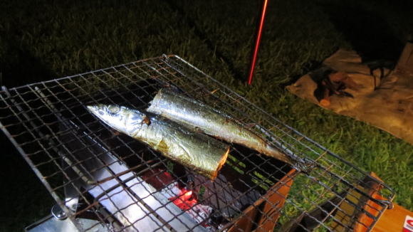 酒のアテは、カツオの刺身に秋刀魚(パック品)を炭火温め・・・