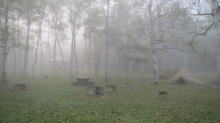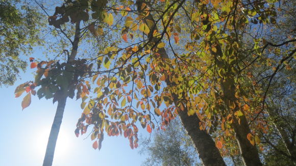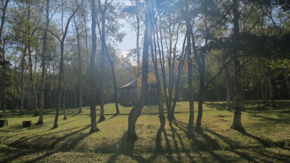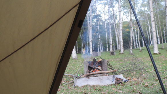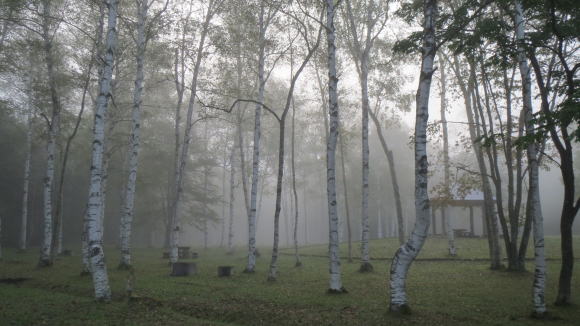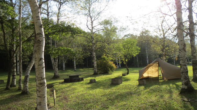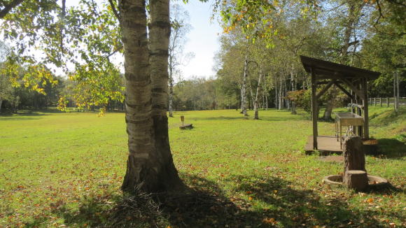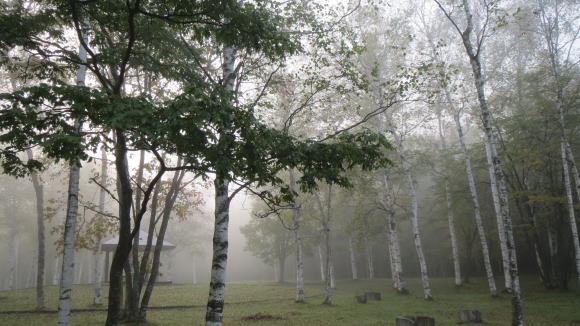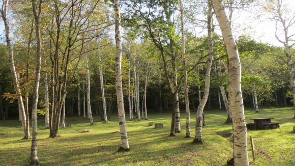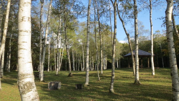 白樺林は緑の葉が枯れ落ちていて、日が射し込んで明るい状況になった。