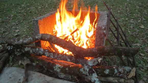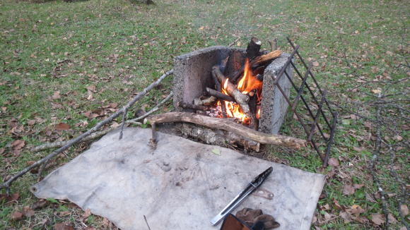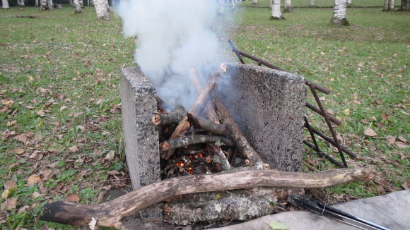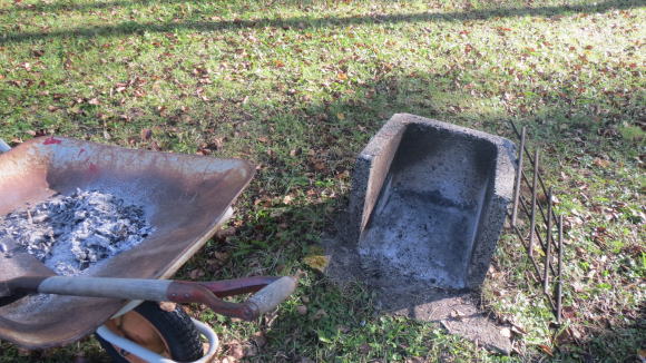 昨晩の焚火したカマドの灰もきちんと片付けます。
