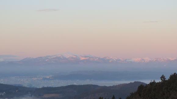 その朝日が西側の栗駒の山々を茜色に照らしはじめます。