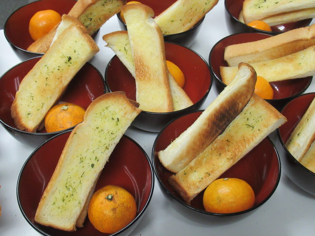 ↑🥖🍊 ガーリックトーストとみかん。カリッとおいしそうな音が聞こえてきそう😋
