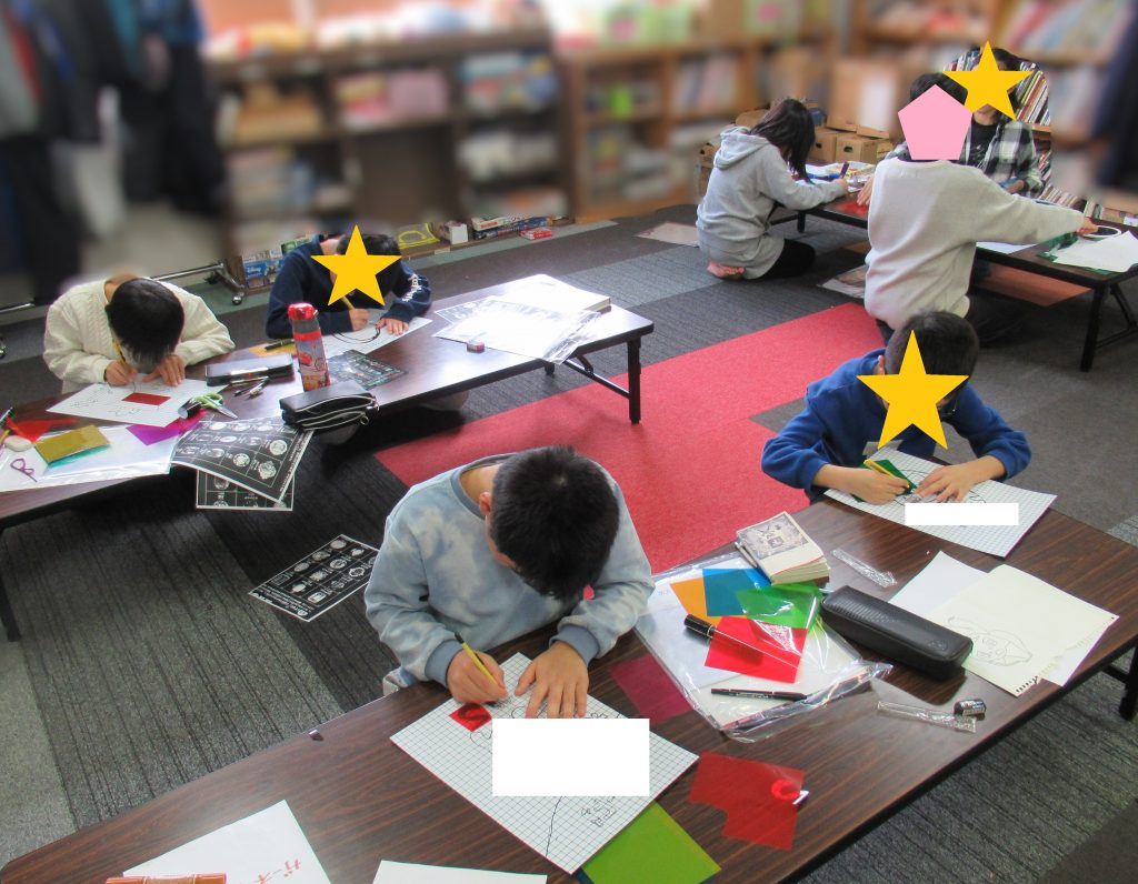 まずは、8色のセロファン、台紙の厚紙、銀紙などがセットになった材料を子どもたちに配布📦✨