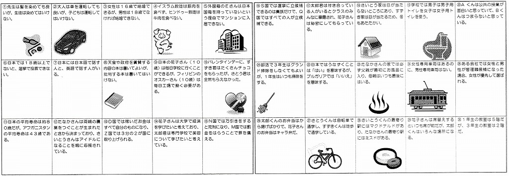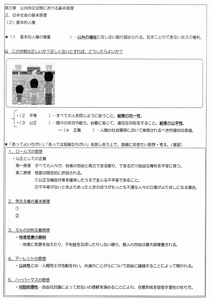 | 公民分科会は、大きな転換点を迎えました。これまで公民分科会を支えてくださっていた諸先生方、ありがとうございました。これからも少しでも多くの先生方とつながり、学び合う場となるよう、情報を発信してまいりたいと思います。 では、何を発信していこうかということになりますが、本部役員会でいただいたアイディアをもとに、公民分科会では、日々の実践報告の場としてこのページを使用させていただきます。 明日の授業をどうしようかと、遅くまで残っているのは社会科の皆さんだったりしないでしょうか。そんな皆さんとの交流の機会が少しでも広がらないか、との思いです。 今回は神奈川県立川和高校の中井先生の授業を紹介させていただきます。社会科部会長の藤元先生のご推薦をいただき、ご紹介させていただいます。ご快諾いただいた中井先生、心より感謝申し上げます。 授業実践紹介 授業者 中井麻莉佳教諭(県立川和高校) 2年生「公共」 本時の授業:大項目「A 公共の扉」「(3)公共的な空間における基本的原理」 川和高校は学力向上進学重点校で公共は2年に設置されており、共通テストで使用する生徒もいます。どの授業でもぺアワークやグループワークが活用され、生徒の主体性を引き出す展開が準備されていますが、中井教諭の授業はグループワークをさらに「深い学び」に繋げていきます。 最初に公平と平等について復習をしていきます。公平と平等についてペアワークで議論させた後、数名の生徒を指名して「どうすれば公平になるのか」意見を述べさせました。踏み台の高さを変えるアイディアを出す生徒もいれば、壁自体を無くそうと答える生徒もいます。いくつかの思想を説明したのちに本日の本題である「あってよい違い」と「あっては危険な違い」についてゲームをするのでグループを作るように指示します。40名のクラスなのでおよそ8グループ程度、4人から5人のグループが作られました。そこに「ちがいのちがいカード」が配られます。以下の資料は『人権学習ワークシート集一人権教育実践のために第16集(小・中学校編)一』(神奈川県教育委員会、令和2年3月)のP10にあるテーマ「2 女性の人権/男女共同参画」の「ちがいのちがい!」を参照し、中井先生が授業用に改良したものです。 ※Iはあえて誤った情報をカードに記入している。 カードはグループごとに一束、裏にして配られます。グループメンバーはカードをシャッフルしたのちにメンバーが一人1枚ずつ手に取って読み上げます。 読み上げた生徒はこれが「あっていい違い」か、「あっては危険な違い」か、自分の意見を述べます。グループ員全員が読み上げ者の意見に賛成すればそのカードは読み上げた生徒が獲得します。もし意見が割れた場合は読み上げた生徒は獲得することができないルールです。生徒はお互いに議論しながらゲームを進めていました。 次号に向けては、まだ白紙状態にあります。是非、シリーズ化していきたいと思いますので、ご協力いただける先生は、ご連絡いただけましたら幸いです。機会をいただけましたら、授業見学にお伺いさせていただきます。 (横浜市立桜丘高校 山口満) ![]() ![]() |