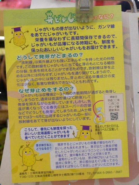 北海道士幌町農協の照射ジャガイモが新潟市内、茨城県守谷市、東京の東久留米市などで売られているとの連絡があり、調べました。茨城県守谷市の店頭には写真のような照射ジャガイモの宣伝文がジャガイモの箱に入っていて、店頭に張り出されていました。