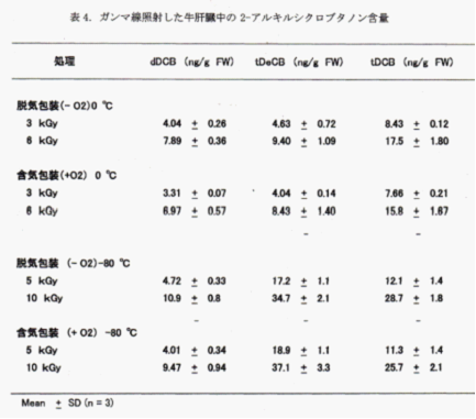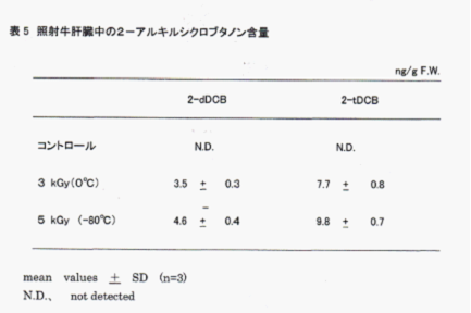●シクロブタノンの検出と増加;牛肝臓5gを試料とし2−ドデシルシクロブタノン、2−テトラシクロブタノンを定量。発ガン物質であるシクロブタノンは表のように生成。