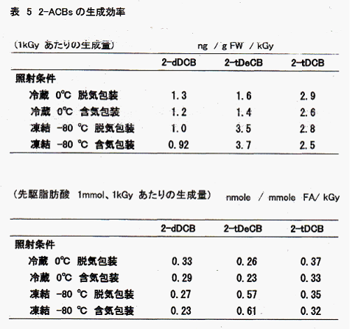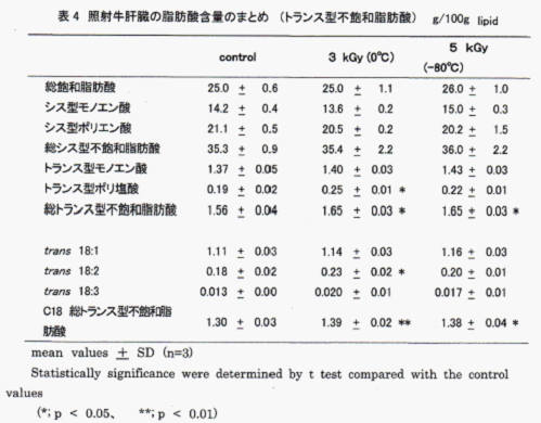脂肪酸はトランス異性化が認められ増加した。トランス脂肪酸は血管に異常を起こすのでマーガリンなどトランス脂肪酸の規制が始まっている。照射はこのトランス脂肪酸も作っていた。